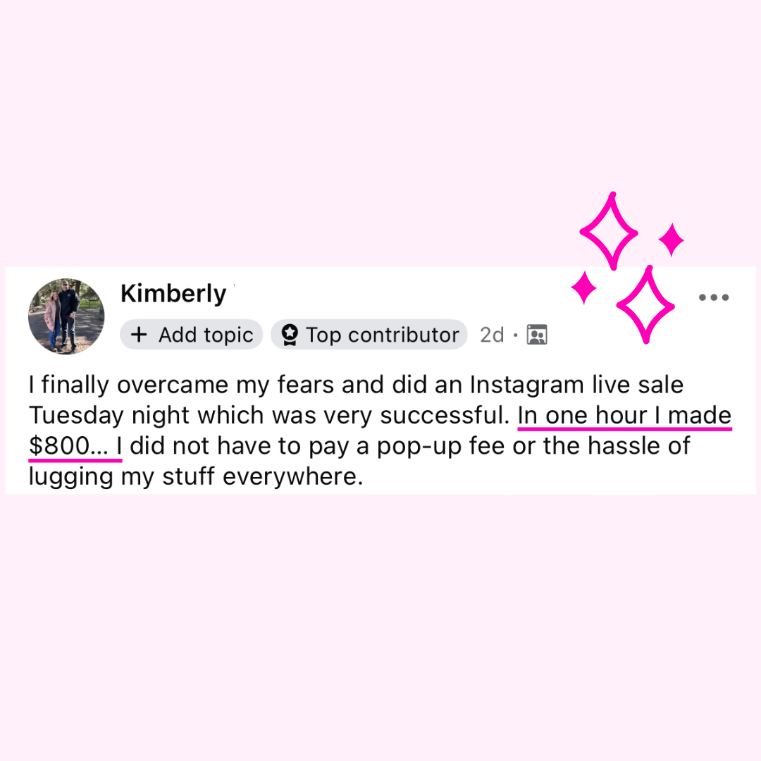 Kimberly learned how to use social media to generate sales rather than relying on markets... and made $800 in one hour on social media.