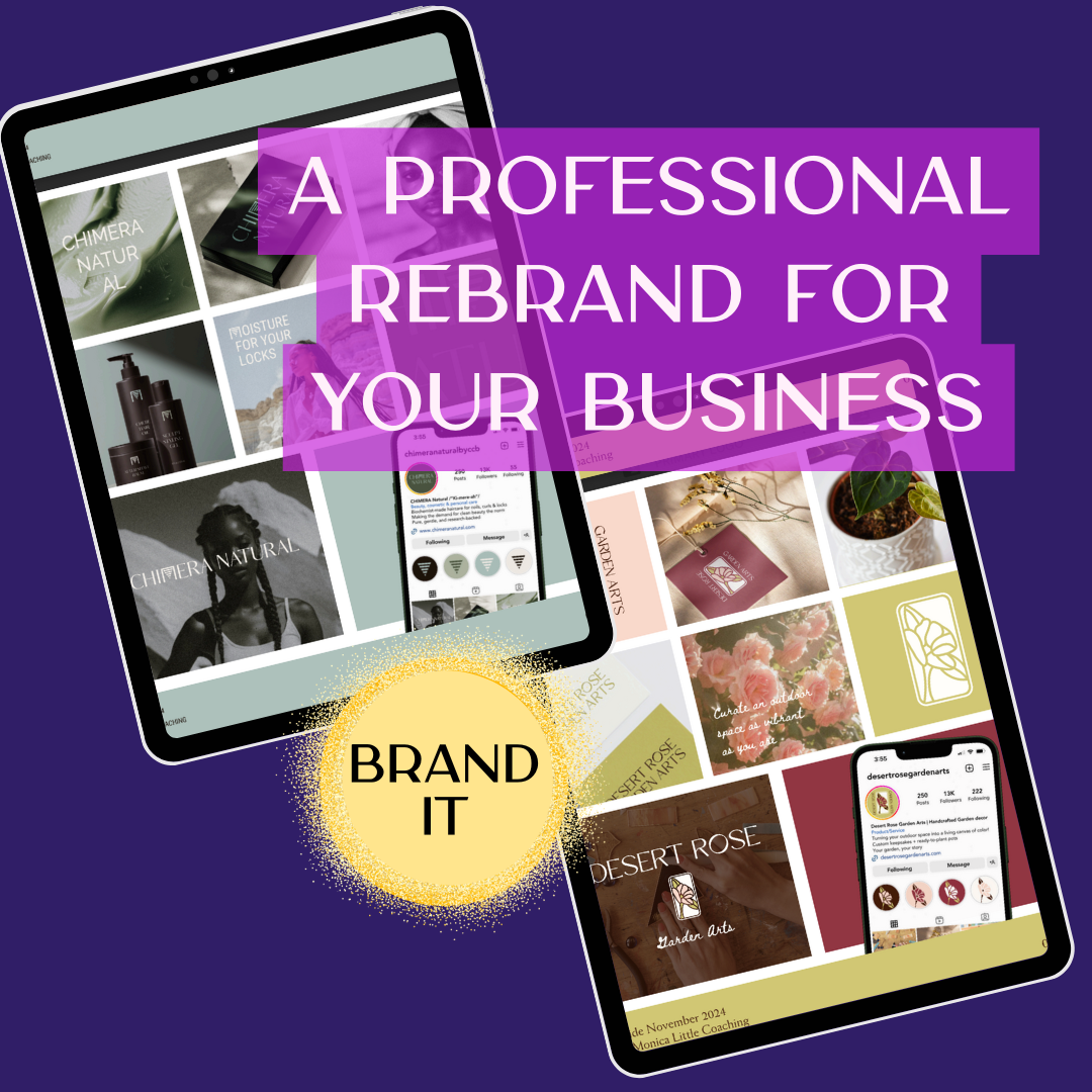 Brand It includes a professional done-for-you rebrand so your business stands out online, plus 3 weeks of JUMPSTART group coaching calls to help you prep for your rebrand and clearly define what makes your business unique.