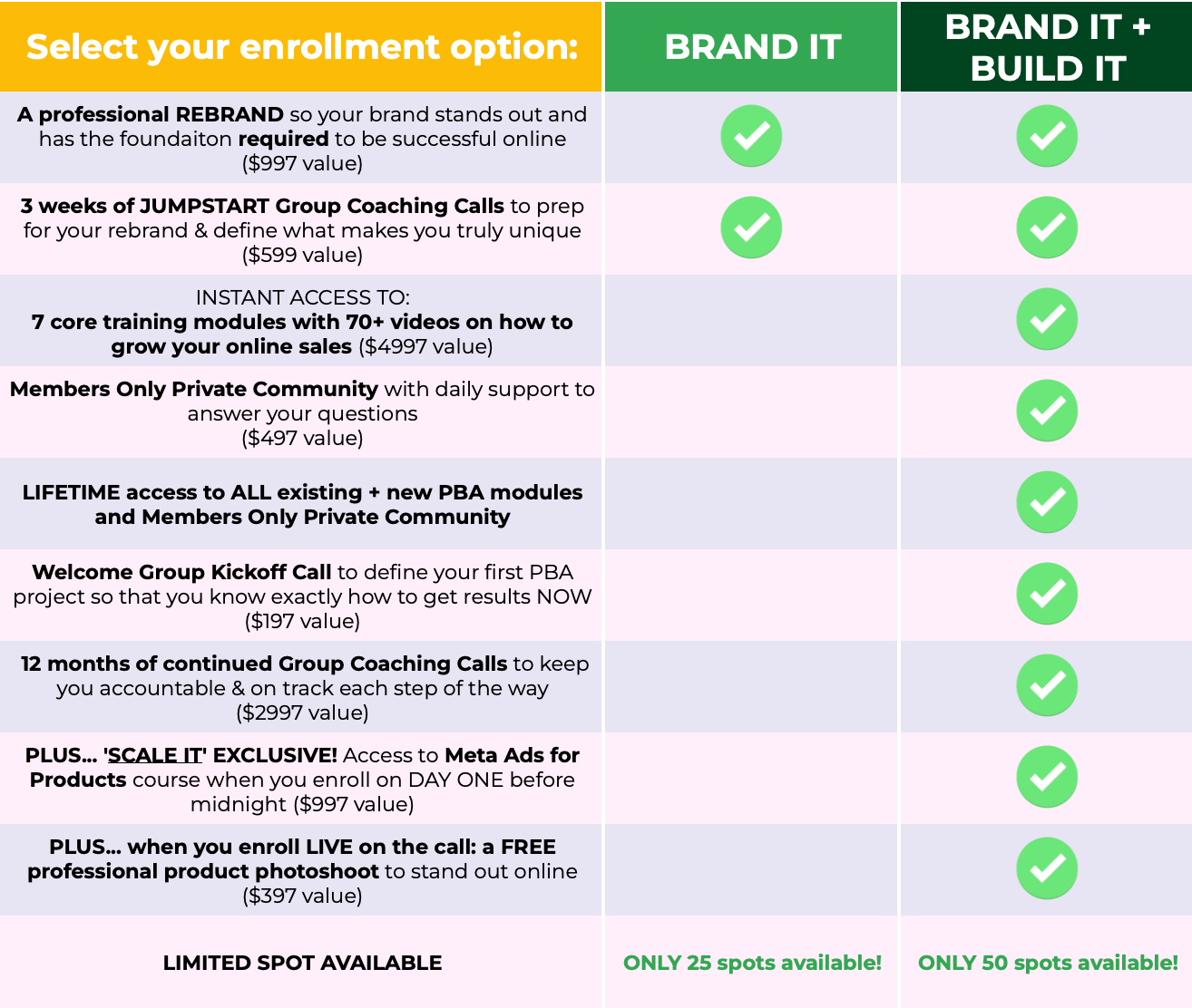 Brand It + Build It includes everything inside Brand It, PLUS instant access to the full Product Biz Academy program (7 core training modules with 70+ videos), Members Only Private Community support, lifetime access to all current + future PBA modules, a Welcome Group Kickoff Call, and 12 months of continued group coaching calls to keep you accountable and supported as you grow. You’ll also receive the Meta Ads for Products course when you enroll on Day 1 before midnight, and if you enroll live on the call you’ll receive a FREE professional product photoshoot.
