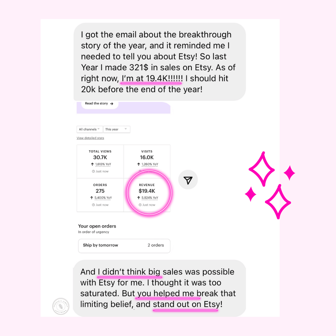 Lindsay went from making $321 on Etsy in one year... to $19,400 in sales on Etsy the next year once she joined Product Biz Academy! That's over 6,000% growth just on Etsy!