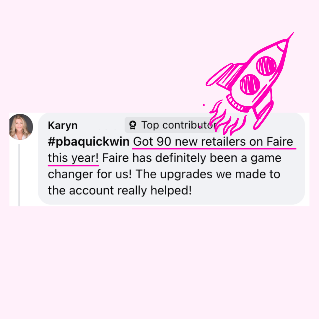 Karyn wanted to create consistent sales for her business without having to be on social media all day everyday or at markets all weekend long. After applying what she learned in Product Biz Academy, she gets NEW wholesale orders week after week after week on Faire because she is getting in front of the RIGHT buyers and store owners!