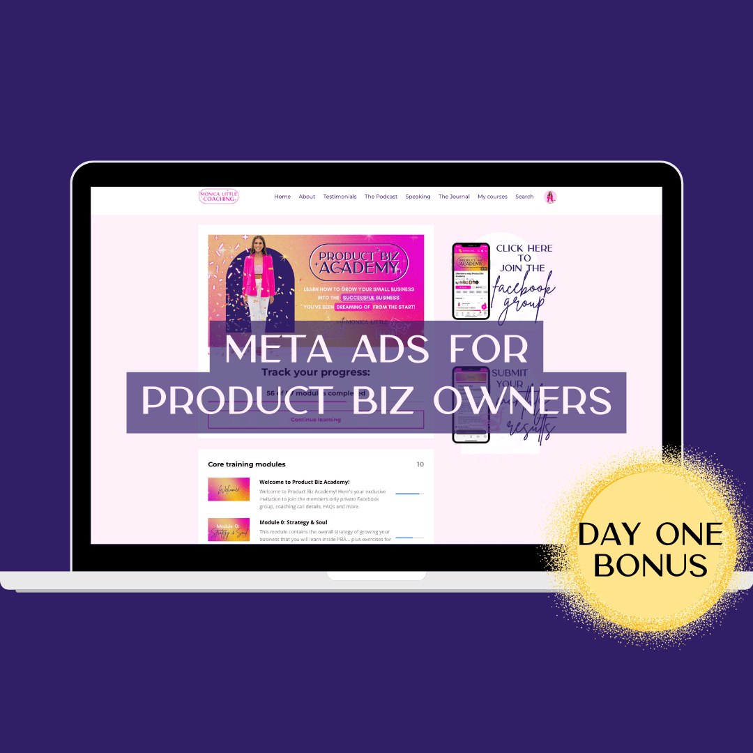 Meta Ads for Product Biz Owners is our newest course that you will have exclusive access to*. This course is being created specifically for Product Business Owners and will show you exactly how to grow your email list, Instagram followers, AND sales using simple Facebook/Instagram ads that DON'T break the bank. My goal with this course is to show you (1) how SIMPLE Facebook/Instagram Ads can really be when done right, since most people overcomplicate them on the tech side and (2) how CHEAP Facebook/Instagram Ads can really be when done right, since most people are doing them incorrectly and spending WAY too much money with no results to show for it. If you want to grow your email list OR grow your Instagram followers OR get more sales without spending HOURS on social media every single day, then this course is for you.
